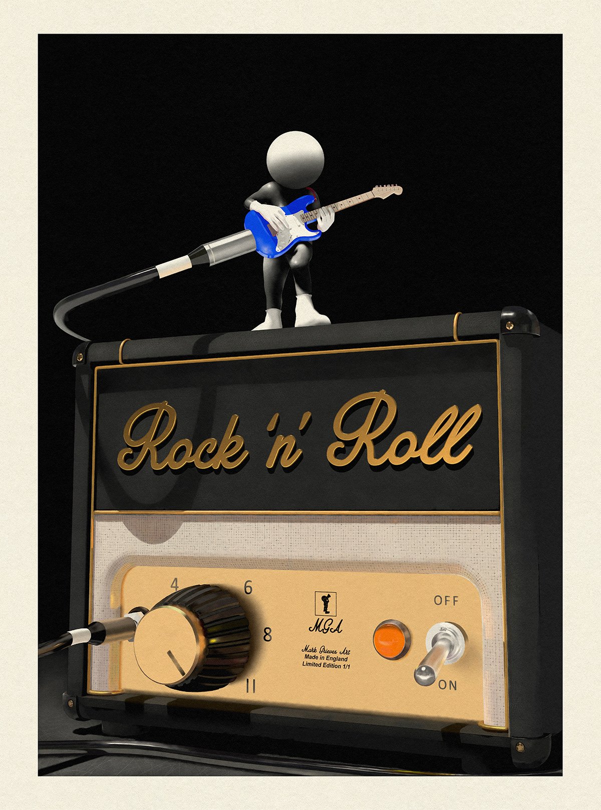 One of a kind Giclee Art Print "Rock 'n' Roll" by published UK artist Mark Grieves. A2 in size 16.5 inches by 23.4 inches with border on high quality textured cotton rag fine art paper. Print only (not framed) Hand signed by the artist. Complete with Certificate of Authenticity.